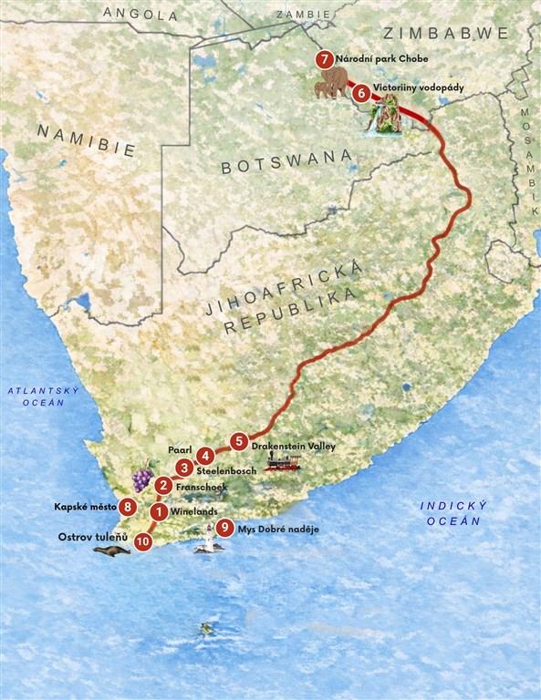 WINELANDS • STEELENBOSCH • FRANSCHHOEK • PAARL • DRAKENSTEIN VALLEY • JÍZDA HISTORICKOU TRAMVAJÍ • VICTORIINY VODOPÁDY • NÁRODNÍ PARK CHOBE • KAPSKÉ MĚSTO • LANOVKA NA STOLOVOU HORU • KAPSKÝ POLOOSTROV • MYS DOBRÉ NADĚJE • PLAVBA NA OSTROV TULEŇŮ