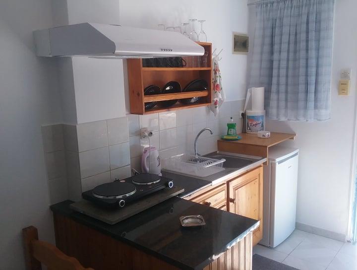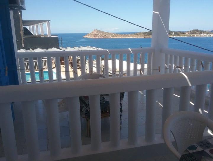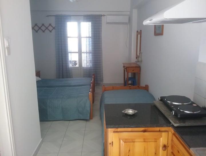 Dvoulůžková studia s velkou terasou s výhledem na moře, stropní ventilátor, klimatizace (5 €/den), lednice, TV/SAT, Wi-Fi, zařízený kuchyňský kout, koupelna, balkon nebo terasa.